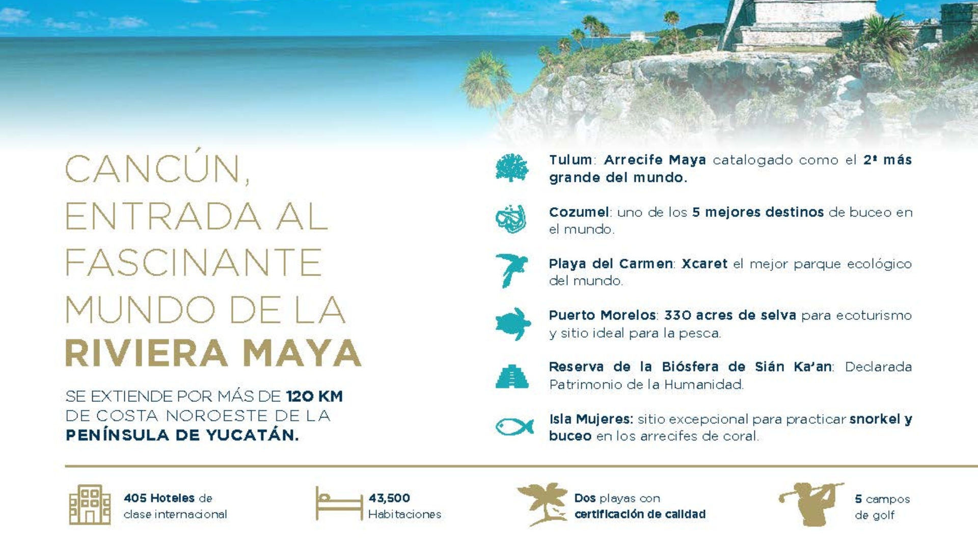 Cancún es un destino turístico completo con playas paradisíacas, actividades acuáticas, cultura maya y vibrante vida nocturna. Ideal para familias, parejas y aventureros, cuenta con una infraestructura turística en crecimiento. Entre sus atracciones destacan Chichén Itzá y la oferta gastronómica. Es el momento perfecto para invertir en Cancún.